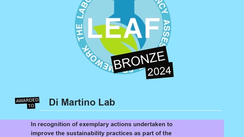 Di Martino Lab is awarded the LEAF bronze certificate in recognition of exemplary actions undertaken to improve the sustainability practices as part of the laboratory efficiency assessment framework (LEAF).