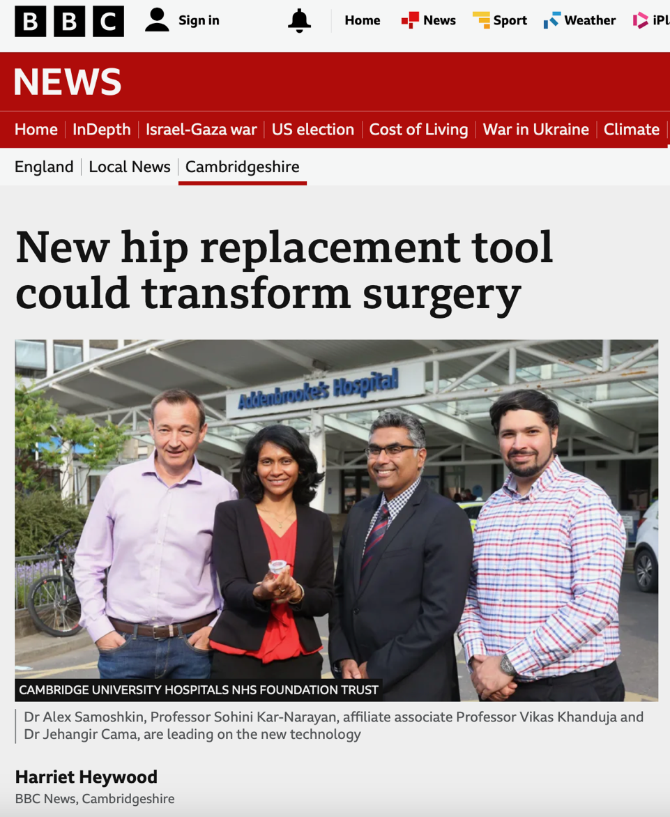It is a great pleasure to see Prof. Sohini Kar-Narayan and her team in the BBC news with their new hip replacement tool. If you want to read more, please see here: https://www.bbc.co.uk/news/articles/c5yp148wp78o